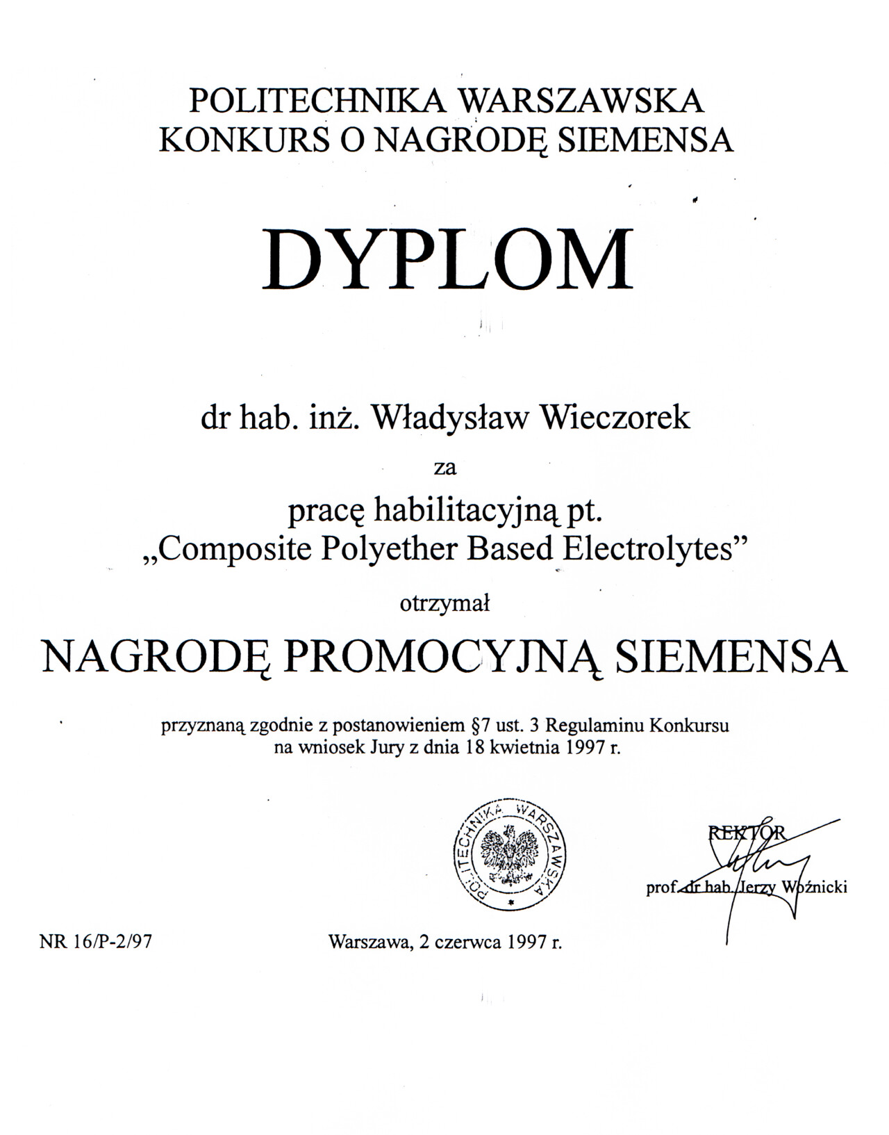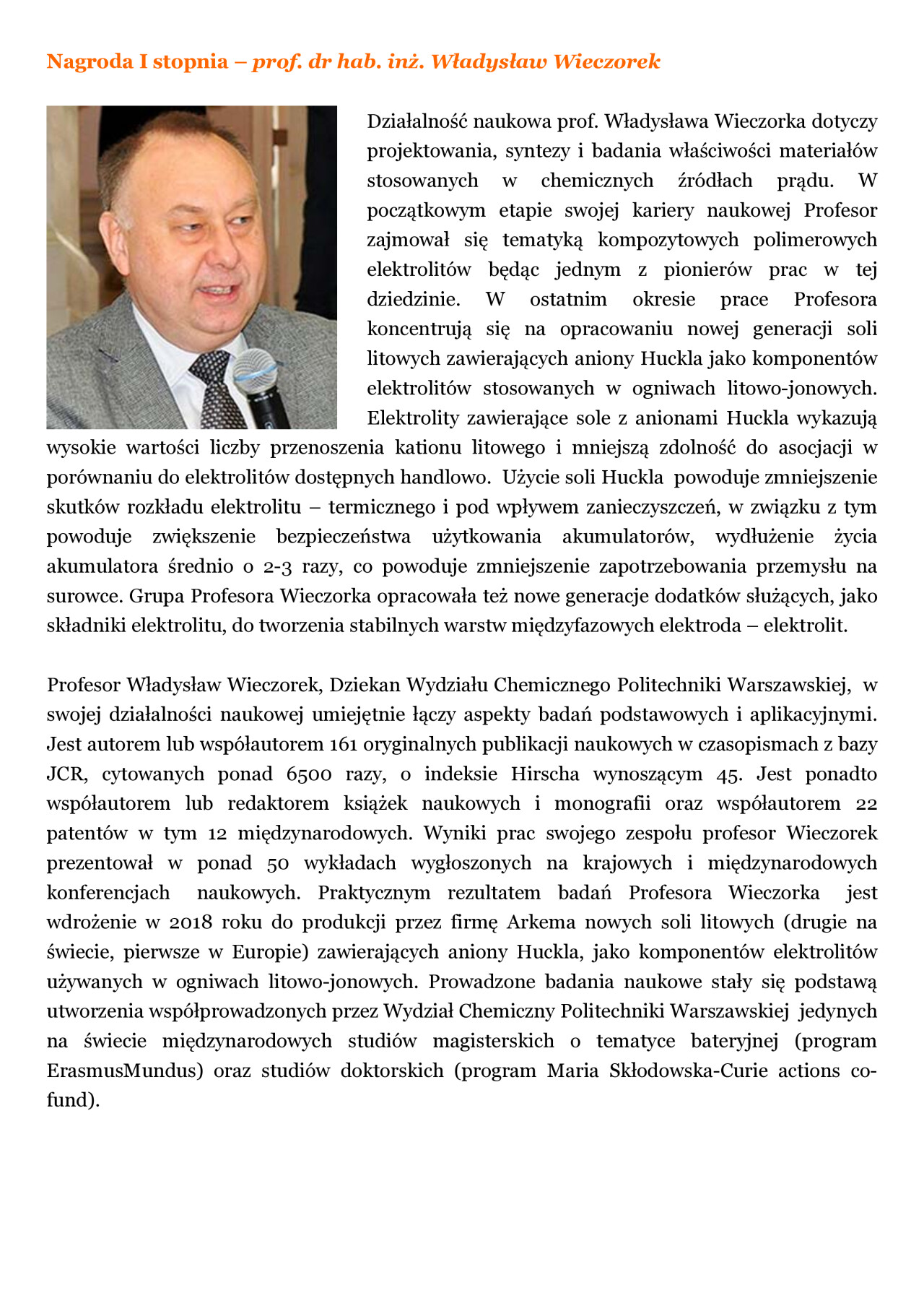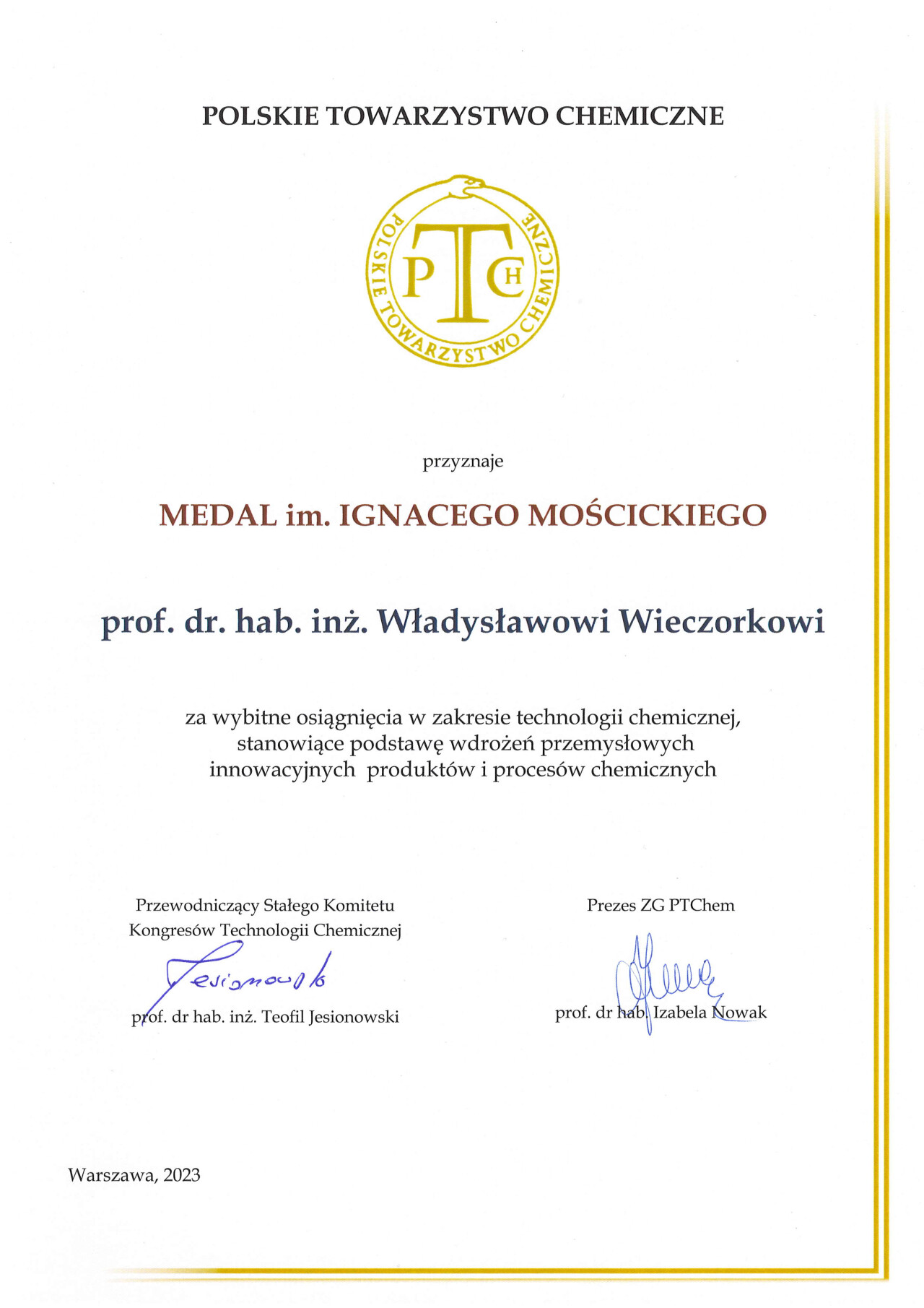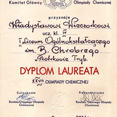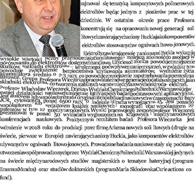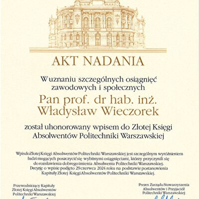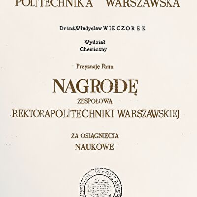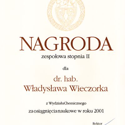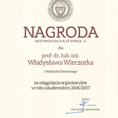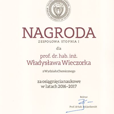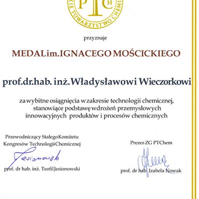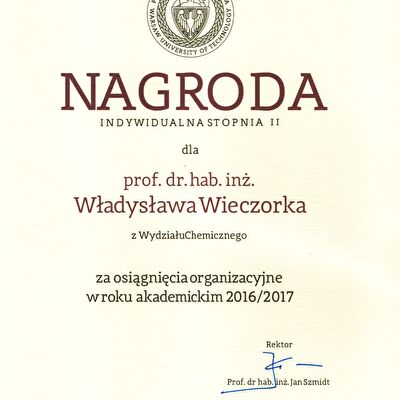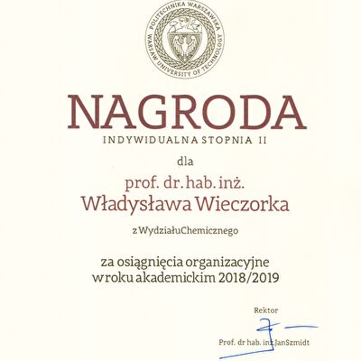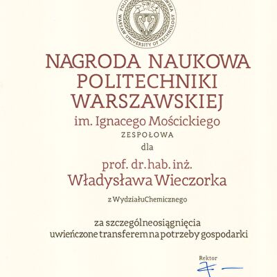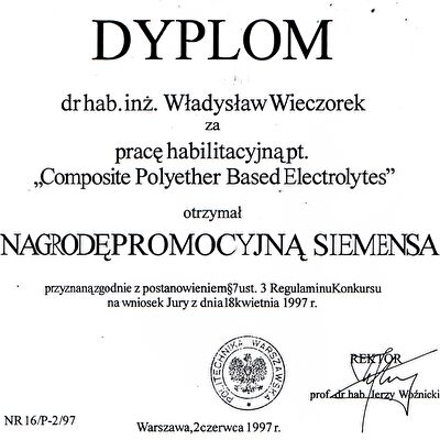 Nagrody i odznaczenia Dyplom Złotej Księgi Absolwentów PW W uznaniu szczególnych osiągnięć zawodowych i społecznych. Laudacja wygłoszona przez Profesora Janusza Plocharskiego podczas Gali Złotej Księgi Politechniki Warszawskiej 2024 wladek_na_medal.pdf Medal im. Ignacego Mościckiego Za wybitne osiągnięcia w zakresie technologii chemicznej, stanowiące podstawę wdrożeń przemysłowych innowacyjnych produktów i procesów chemicznych. Nagroda im. W. Świętosławskiego 2021 Nagroda I stopnia Nagroda Naukowa Politechniki Warszawskiej im. Ignacego Mościckiego Za szczególne osiągnięcia uwieńczone transferem na potrzeby gospodarki. Pro Ecclesia et Pontifice Odznaczenie papieskie Pro Ecclesia et Pontifice. Pro_Ecclesia_et_Pontifice_Wladyslaw_Wieczorek.pdf Nagroda Indywidualna Stopnia II Za osiągnięcia organizacyjne w roku akademickim 2018/2019. Nagroda Zespołowa Stopnia I Za osiągnięcia naukowe w latach 2016-2017. Nagroda Indywidualna Stopnia II Za osiągnięcia organizacyjne w roku akademickim 2016/2017. Nagroda Indywidualna Stopnia II Za osiągnięcia organizacyjne w roku akademickim 2016/2017. Nagroda zespołowa stopnia II Za osiągnięcia naukowe w roku 2001. Nagroda Siemensa Za pracę habilitacyjną pt. «Composite Polyether Based Electrolytes» Nagroda zespołowa Rektora Politechniki Warszawskiej Nagroda Rektora za wybitne osiągnięcia naukowe, Politechnika Warszawska Nagroda Ministra Edukacji Narodowej Nagroda Ministra Edukacji Narodowej za pracę doktorską pt. „Wysokoprzewodzące modyfikowane stałe elektrolity polieterowe” Laureat Olimpiady Chemicznej XXVII Olimpiada Chemiczna