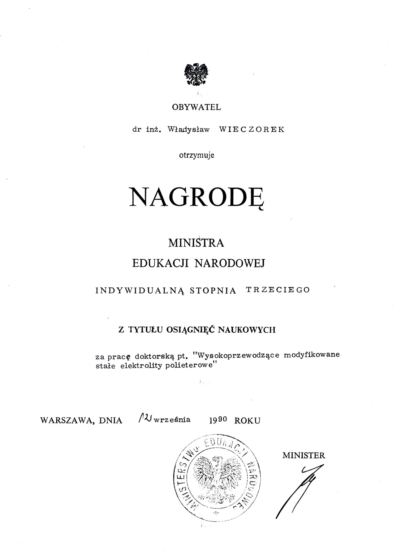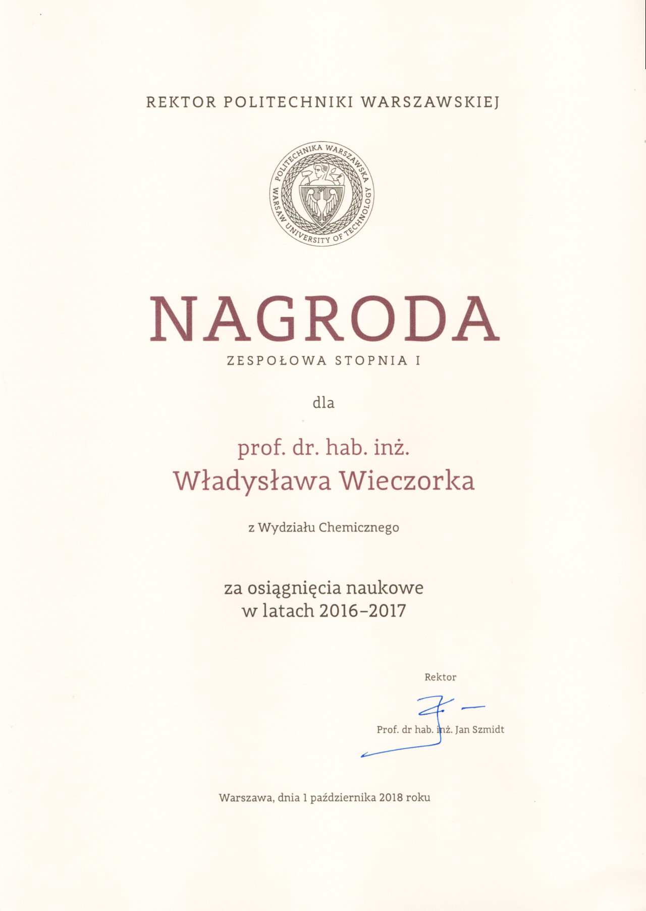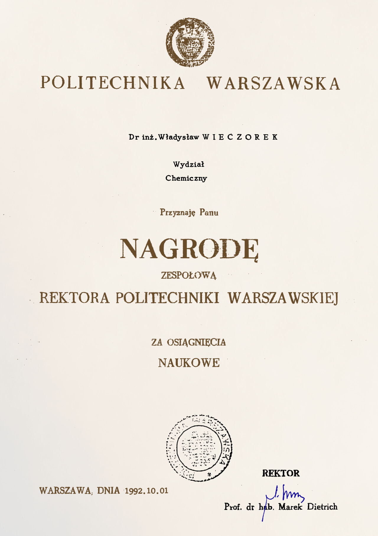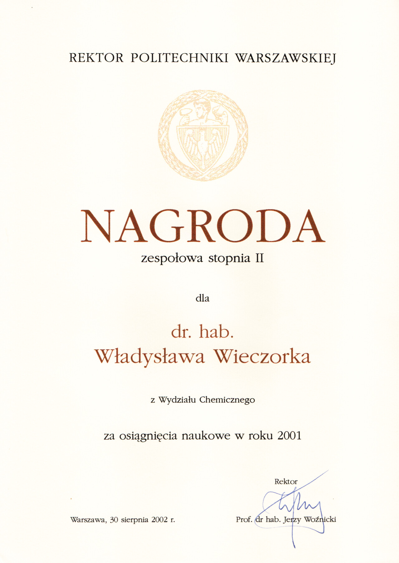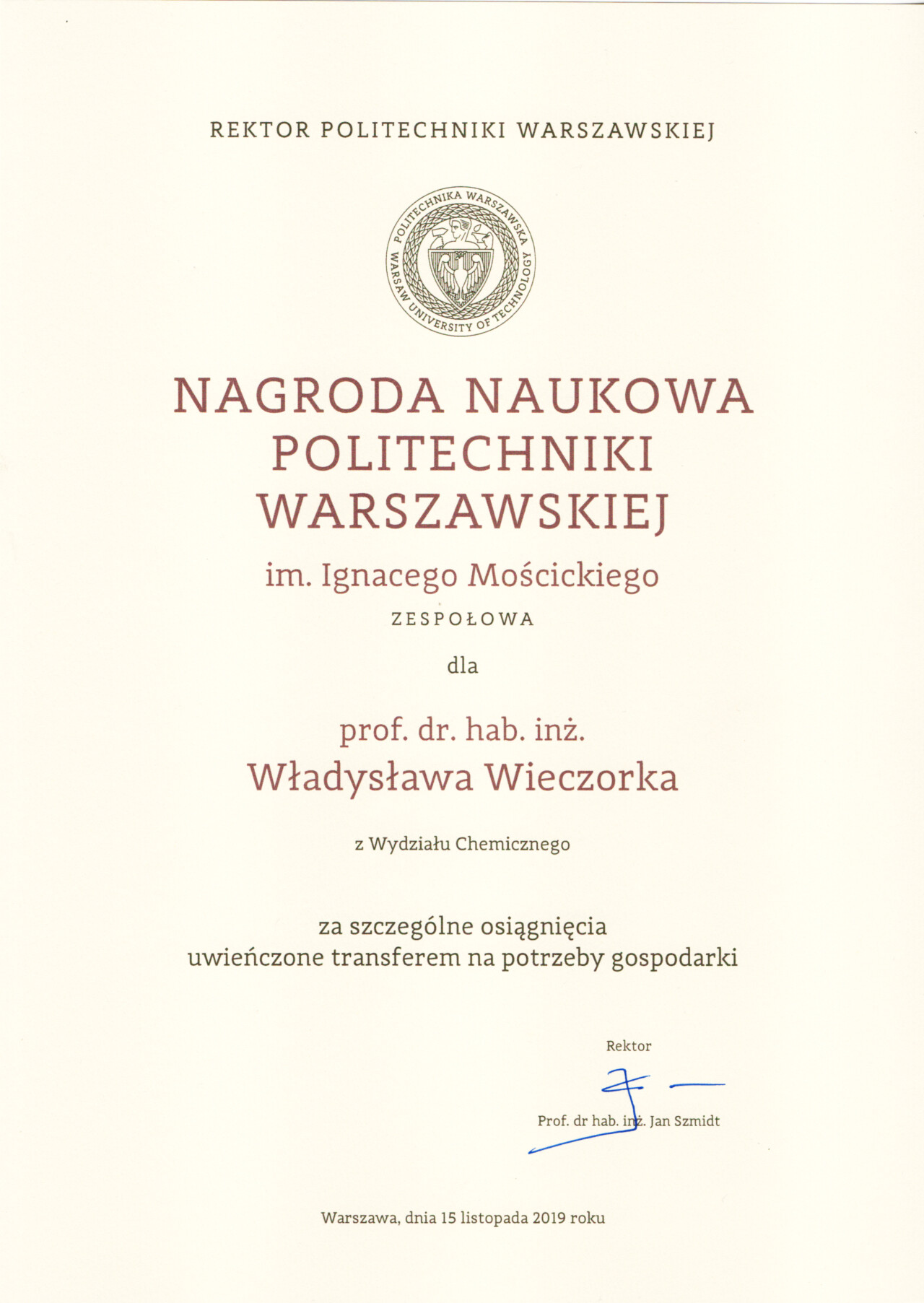 Nagrody i odznaczenia Dyplom Złotej Księgi Absolwentów PW W uznaniu szczególnych osiągnięć zawodowych i społecznych. Laudacja wygłoszona przez Profesora Janusza Plocharskiego podczas Gali Złotej Księgi Politechniki Warszawskiej 2024 wladek_na_medal.pdf Medal im. Ignacego Mościckiego Za wybitne osiągnięcia w zakresie technologii chemicznej, stanowiące podstawę wdrożeń przemysłowych innowacyjnych produktów i procesów chemicznych. Nagroda im. W. Świętosławskiego 2021 Nagroda I stopnia Nagroda Naukowa Politechniki Warszawskiej im. Ignacego Mościckiego Za szczególne osiągnięcia uwieńczone transferem na potrzeby gospodarki. Pro Ecclesia et Pontifice Odznaczenie papieskie Pro Ecclesia et Pontifice. Pro_Ecclesia_et_Pontifice_Wladyslaw_Wieczorek.pdf Nagroda Indywidualna Stopnia II Za osiągnięcia organizacyjne w roku akademickim 2018/2019. Nagroda Zespołowa Stopnia I Za osiągnięcia naukowe w latach 2016-2017. Nagroda Indywidualna Stopnia II Za osiągnięcia organizacyjne w roku akademickim 2016/2017. Nagroda Indywidualna Stopnia II Za osiągnięcia organizacyjne w roku akademickim 2016/2017. Nagroda zespołowa stopnia II Za osiągnięcia naukowe w roku 2001. Nagroda Siemensa Za pracę habilitacyjną pt. «Composite Polyether Based Electrolytes» Nagroda zespołowa Rektora Politechniki Warszawskiej Nagroda Rektora za wybitne osiągnięcia naukowe, Politechnika Warszawska Nagroda Ministra Edukacji Narodowej Nagroda Ministra Edukacji Narodowej za pracę doktorską pt. „Wysokoprzewodzące modyfikowane stałe elektrolity polieterowe” Laureat Olimpiady Chemicznej XXVII Olimpiada Chemiczna