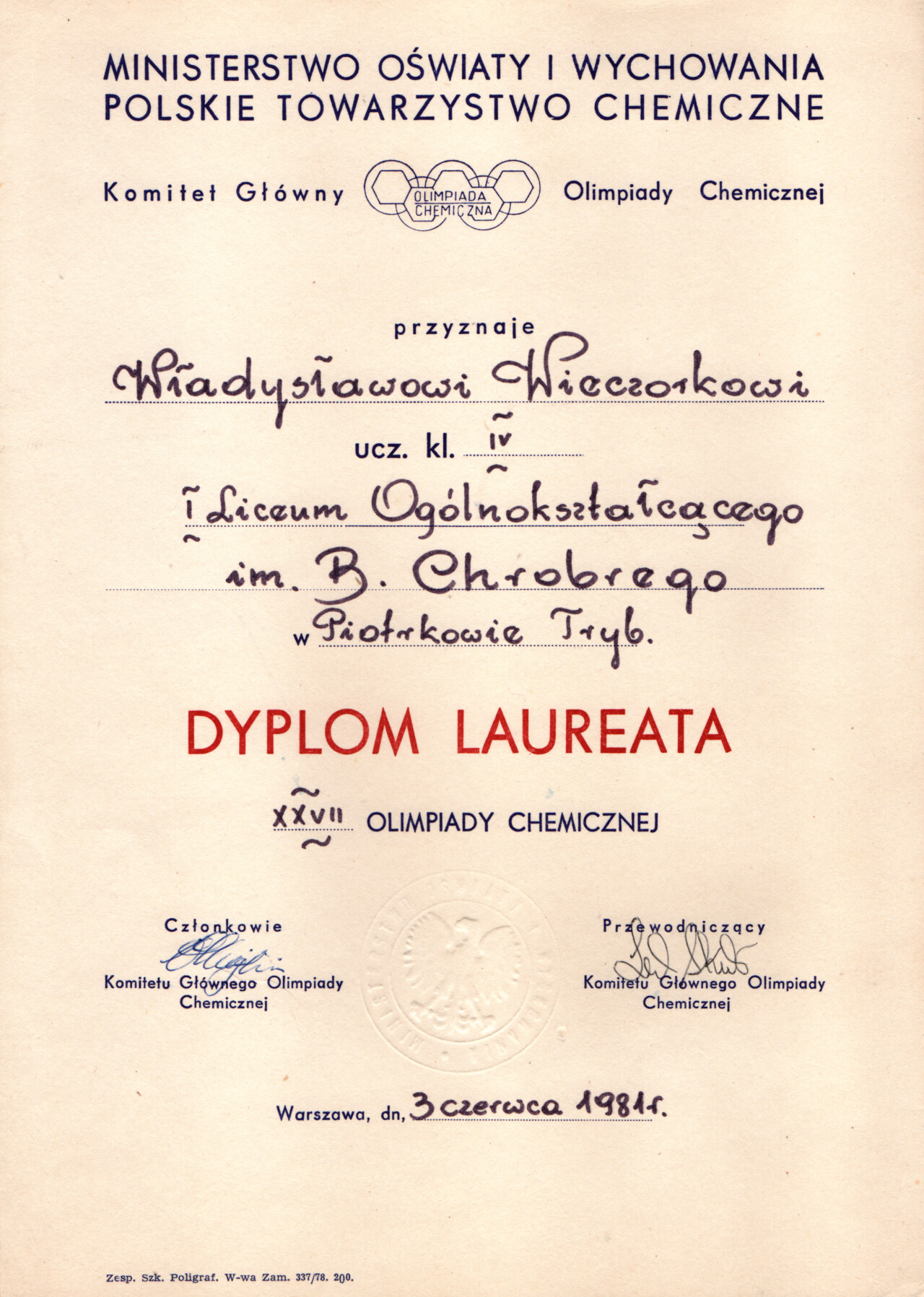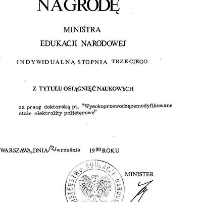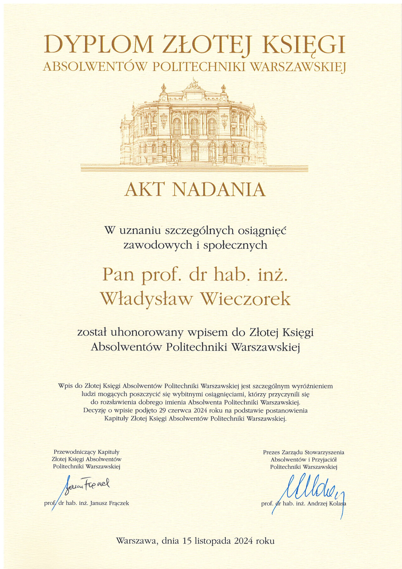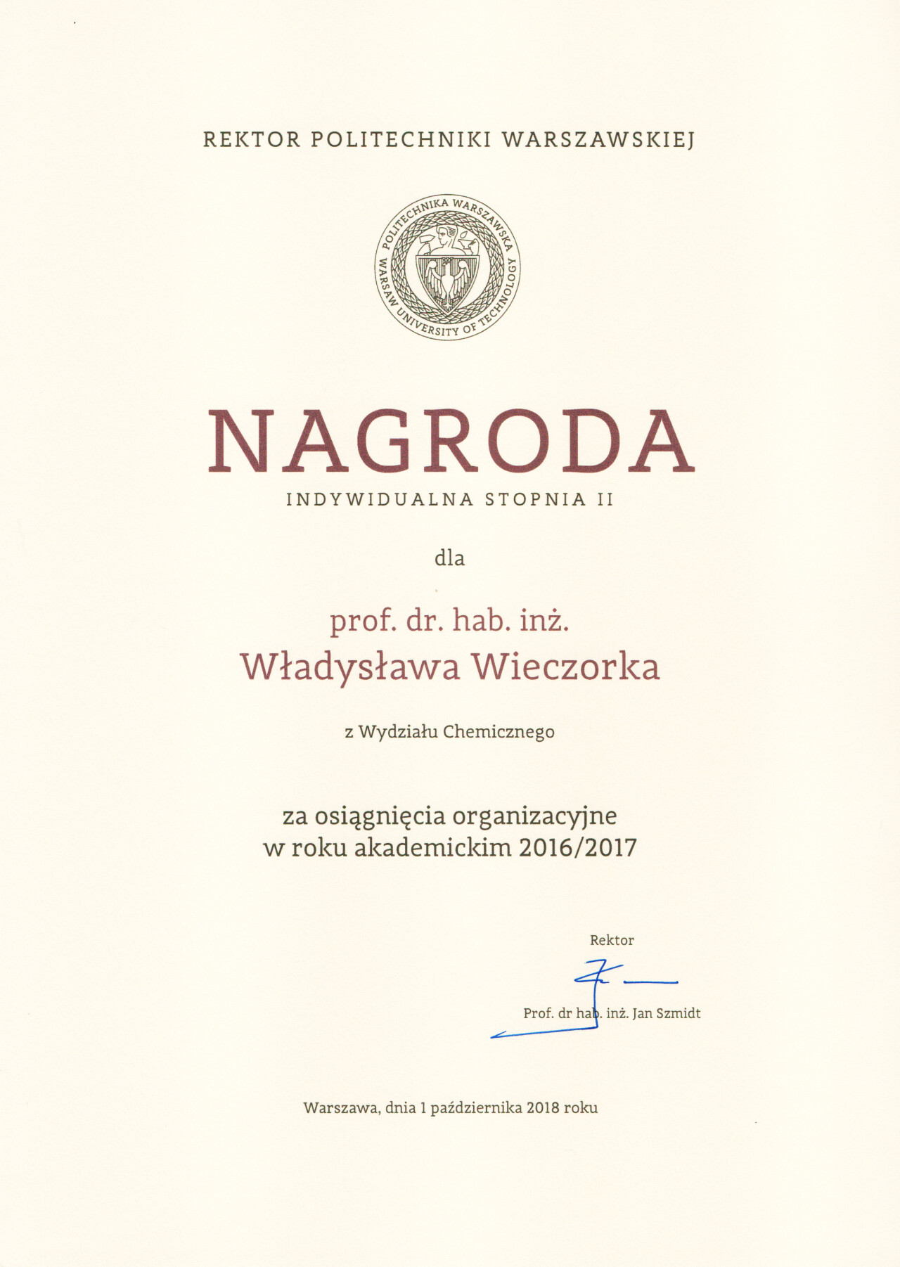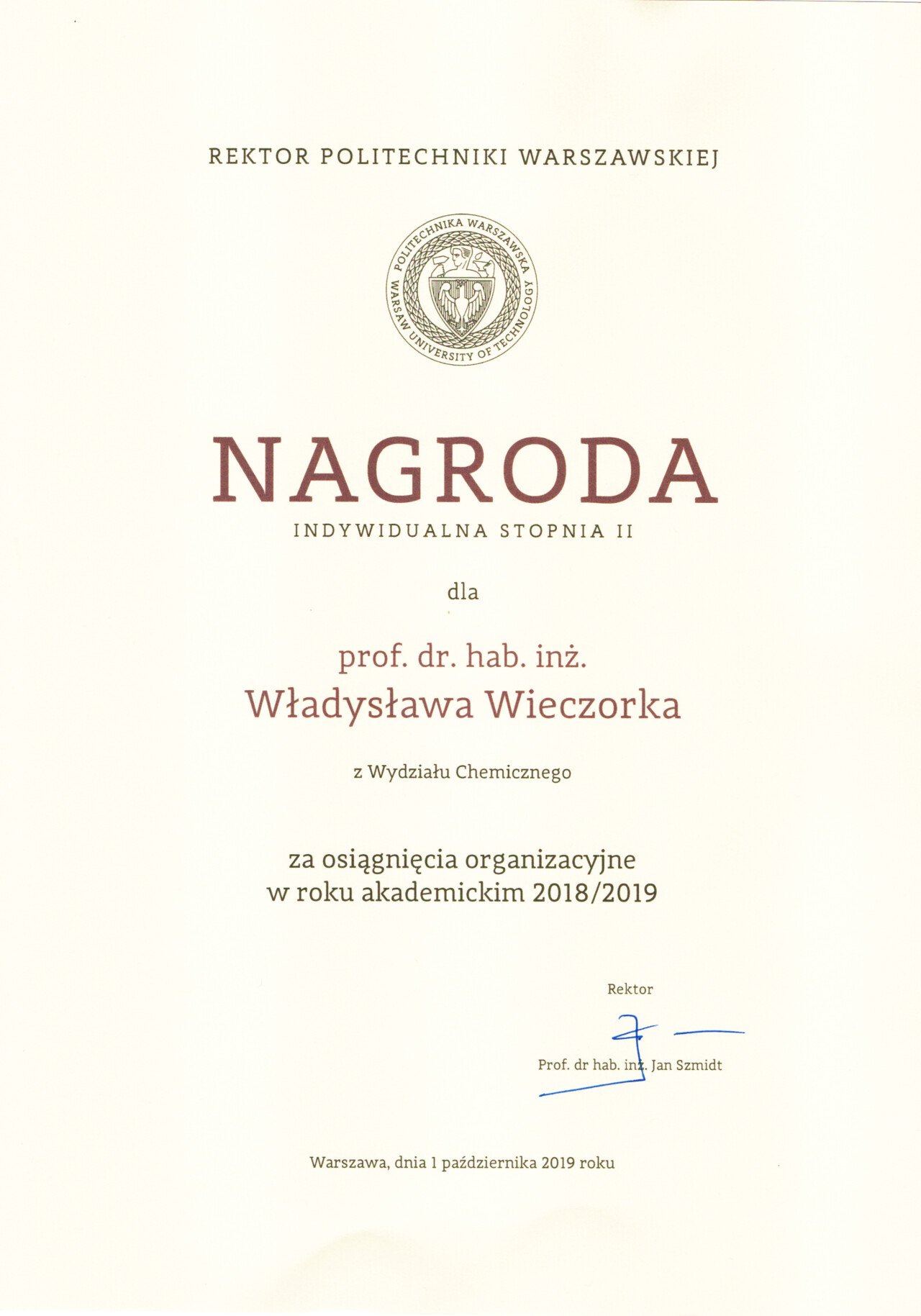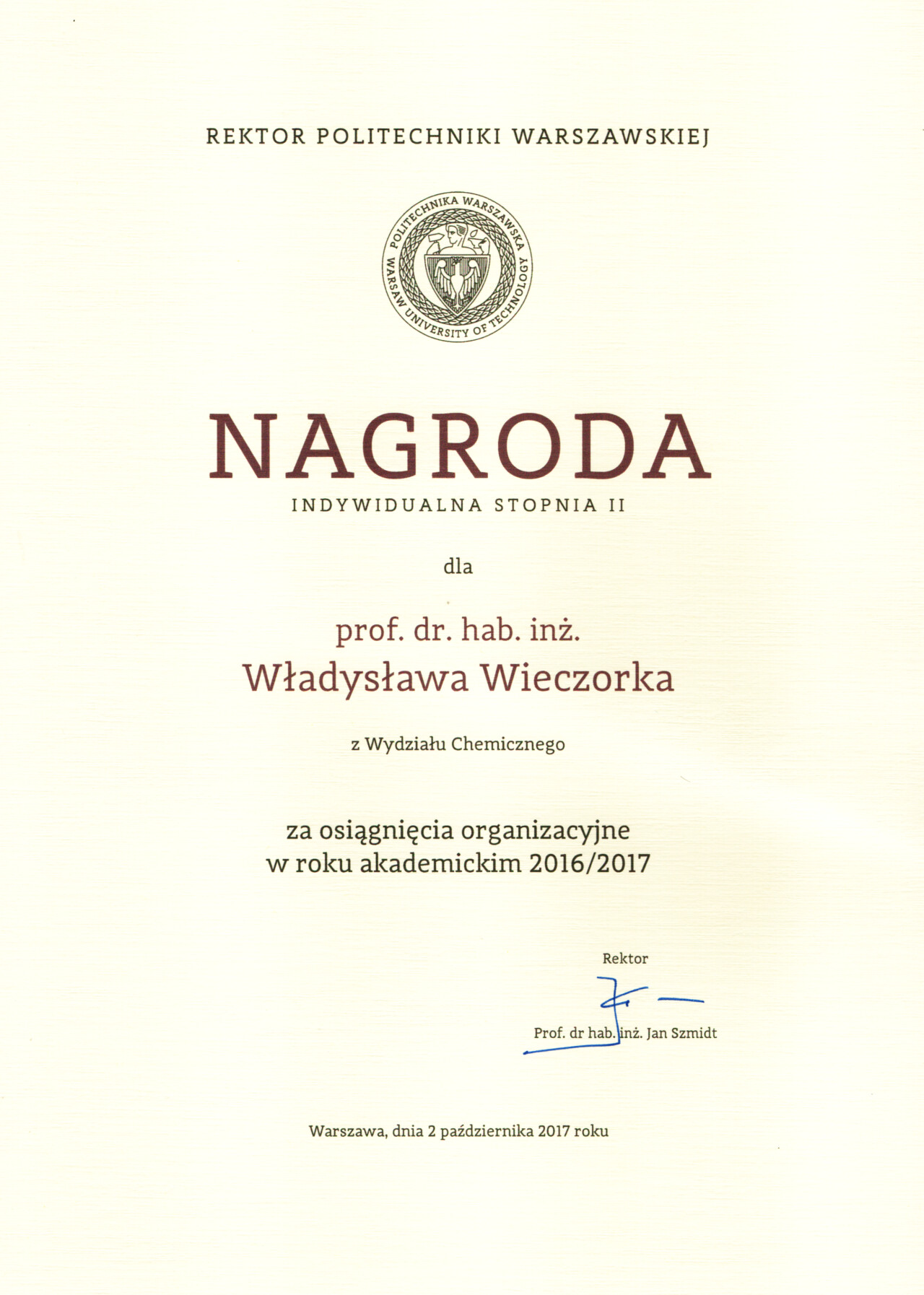 Nagrody i odznaczenia Dyplom Złotej Księgi Absolwentów PW W uznaniu szczególnych osiągnięć zawodowych i społecznych. Laudacja wygłoszona przez Profesora Janusza Plocharskiego podczas Gali Złotej Księgi Politechniki Warszawskiej 2024 wladek_na_medal.pdf Medal im. Ignacego Mościckiego Za wybitne osiągnięcia w zakresie technologii chemicznej, stanowiące podstawę wdrożeń przemysłowych innowacyjnych produktów i procesów chemicznych. Nagroda im. W. Świętosławskiego 2021 Nagroda I stopnia Nagroda Naukowa Politechniki Warszawskiej im. Ignacego Mościckiego Za szczególne osiągnięcia uwieńczone transferem na potrzeby gospodarki. Pro Ecclesia et Pontifice Odznaczenie papieskie Pro Ecclesia et Pontifice. Pro_Ecclesia_et_Pontifice_Wladyslaw_Wieczorek.pdf Nagroda Indywidualna Stopnia II Za osiągnięcia organizacyjne w roku akademickim 2018/2019. Nagroda Zespołowa Stopnia I Za osiągnięcia naukowe w latach 2016-2017. Nagroda Indywidualna Stopnia II Za osiągnięcia organizacyjne w roku akademickim 2016/2017. Nagroda Indywidualna Stopnia II Za osiągnięcia organizacyjne w roku akademickim 2016/2017. Nagroda zespołowa stopnia II Za osiągnięcia naukowe w roku 2001. Nagroda Siemensa Za pracę habilitacyjną pt. «Composite Polyether Based Electrolytes» Nagroda zespołowa Rektora Politechniki Warszawskiej Nagroda Rektora za wybitne osiągnięcia naukowe, Politechnika Warszawska Nagroda Ministra Edukacji Narodowej Nagroda Ministra Edukacji Narodowej za pracę doktorską pt. „Wysokoprzewodzące modyfikowane stałe elektrolity polieterowe” Laureat Olimpiady Chemicznej XXVII Olimpiada Chemiczna
