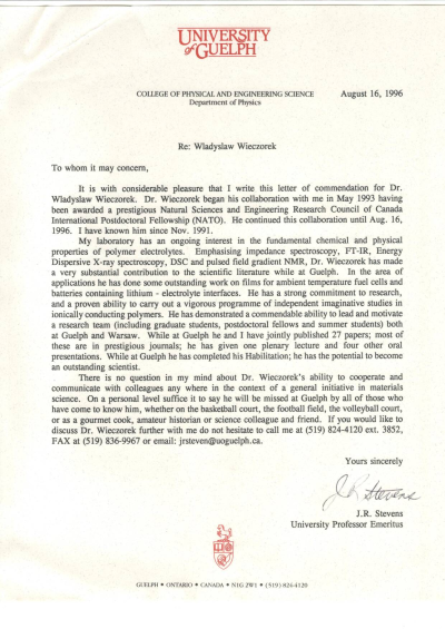 W roku 1993 wygrałem konkurs na stypendium biura naukowego NATO i w okresie maj 1993 — sierpień 1996 przebywałem jako NATO International Postdoctoral Fellow na University of Guelph, Guelph, Canada w grupie Prof. J.R. Stevensa. Odbyłem też dwa krótkoterminowe staże naukowe w Chalmers University, Goeteborg (kwiecień 1992, grupa Prof. C. Granquista) i CNR TAE Messina (listopad-grudzień 1989, grupa prof. N. Giordano).